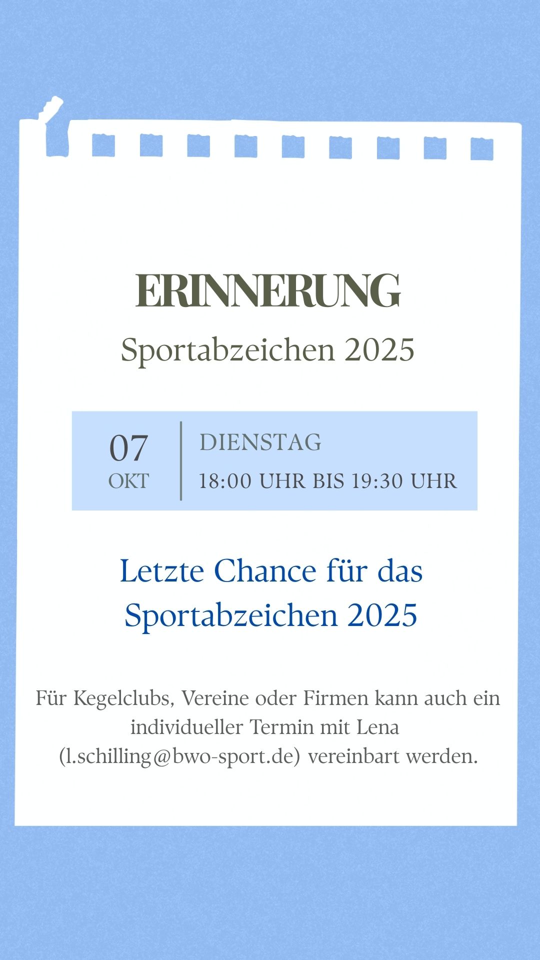 Alle Sportler, die das Sportabzeichen 2025 auf die To-do-Liste als „noch nicht erledigt“ markiert haben, sollten am 7. Oktober die letzte Chance in diesem Jahr ergreifen.