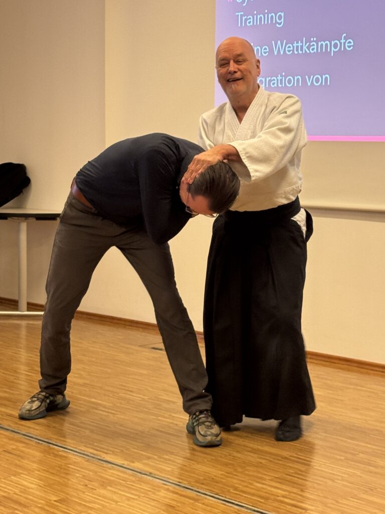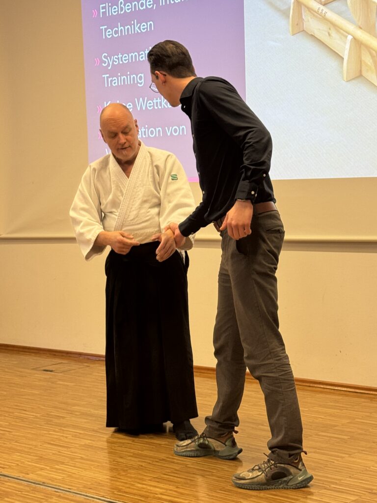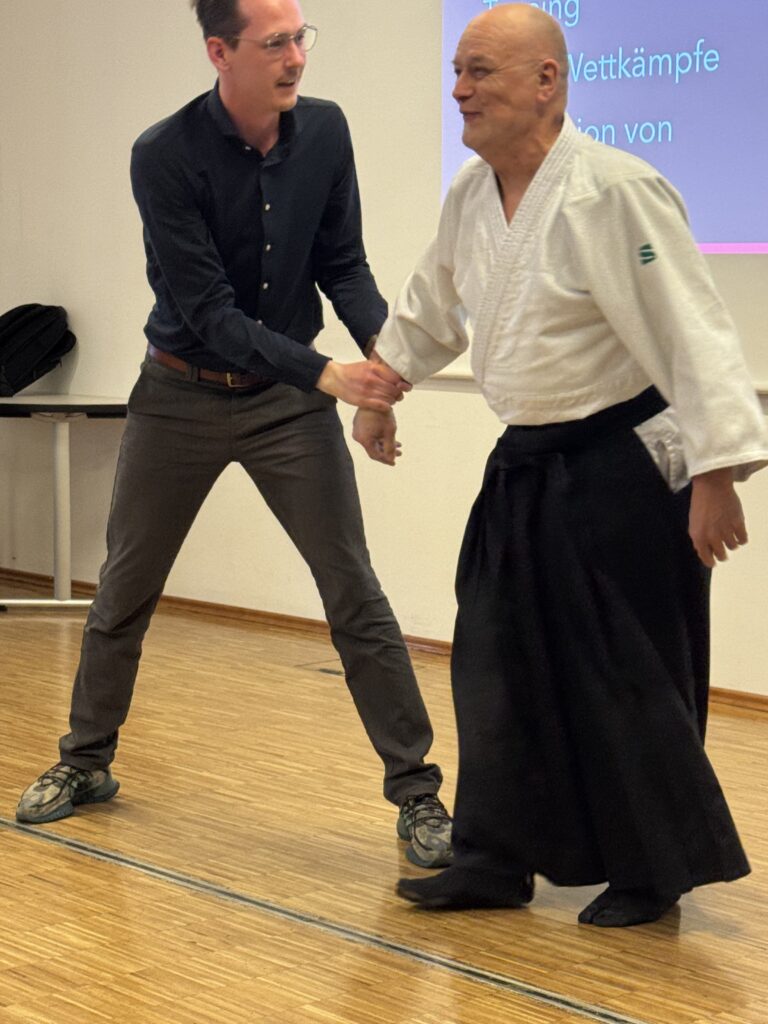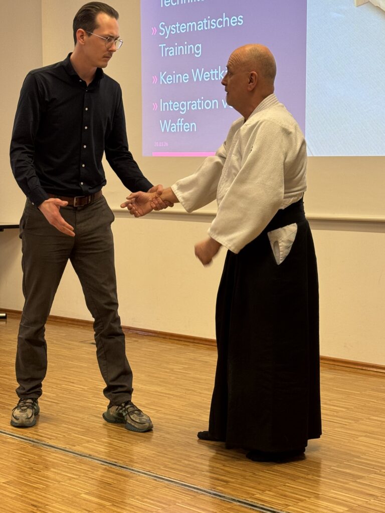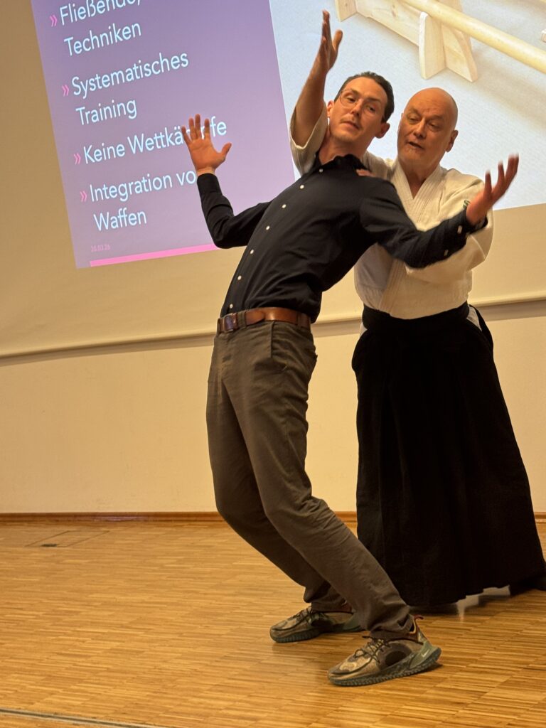 Dr. Jochen Schepers, 5. Dan BDAL, und Ino Rohloff, 3. Dan BDAL, führten eine beeindruckende Aikido-Vorführung in Münster vor und zeigten dabei die Grundprinzipien dieser japanischen Kampfkunst: fließende Bewegungen, Konzentration und effektive Selbstverteidigungstechniken. Die Mitarbeitenden konnten hautnah erleben, wie Körperbeherrschung, Respekt und Aikido-Techniken zur Kampfkunst für Erwachsene im Münsterland gehören.